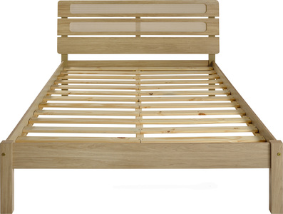 bed frames in light oak with rattan‑effect accents: