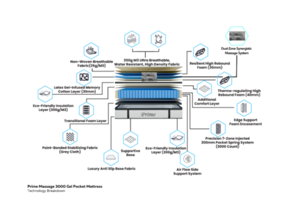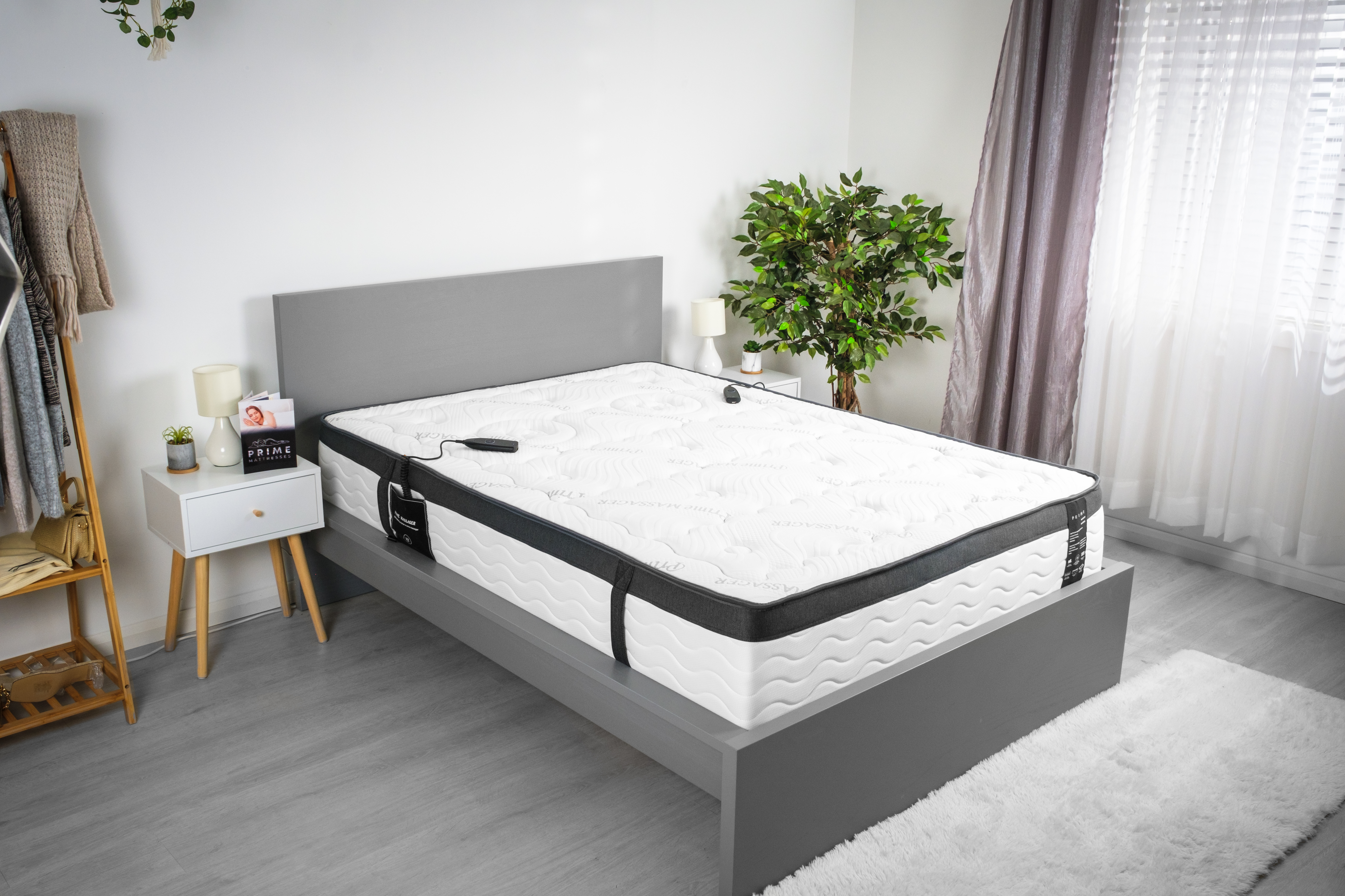 Experience unparalleled comfort and relaxation with the Prime Mattresses massage mattress. Featuring 3000 pocket gel springs, a 12-inch depth with pillow top memory foam, and a unique kneading massage function, this mattress is designed to relieve muscle tension, improve circulation, and promote better sleep. Made with hypoallergenic, breathable, and eco-friendly materials, it’s perfect for athletes and individuals with back pain. Enjoy easy control with the included remote and rest assured with its certified fire retardancy and durability for up to 5500 sessions. Available in single, double, and king sizes with dual massage units for the larger sizes.